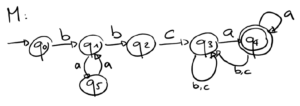 Die Sprache vom DEA \(M\) ist die reguläre Sprache \(L(M) = \{ bxbcya | x = a^n \) für \(n\) gerade & \( y \in \{a, b, c\}^*\}\).